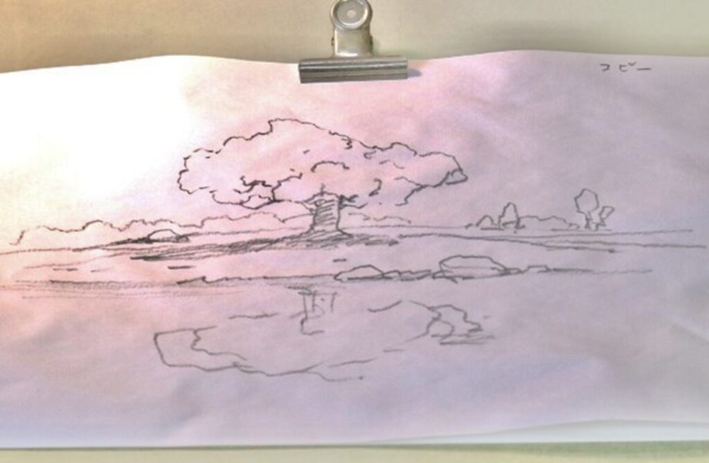 はじめはこのような下書きから始まります。湖に浮かぶ小島のような場所に、樹が立っている景色です。それが、すすっと次郎さんの筆がすすむたびに、美しく色づいて行きます。