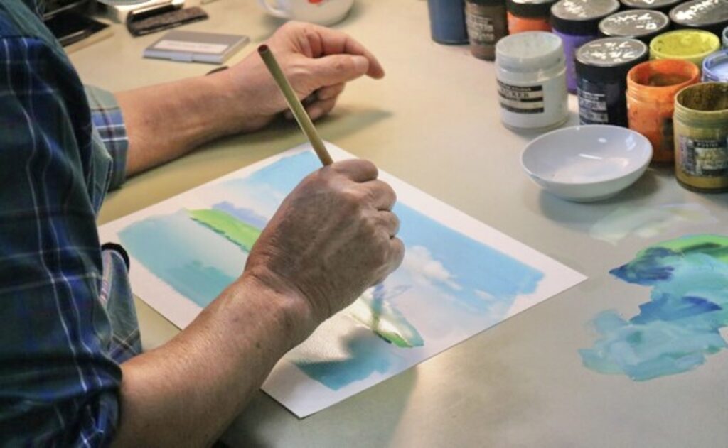 インタビューの途中には制作の一場面も、見せて頂くことができました。 次郎さんがもっとも得意とするのは、筆と絵の具を使用してのアナログ絵です。