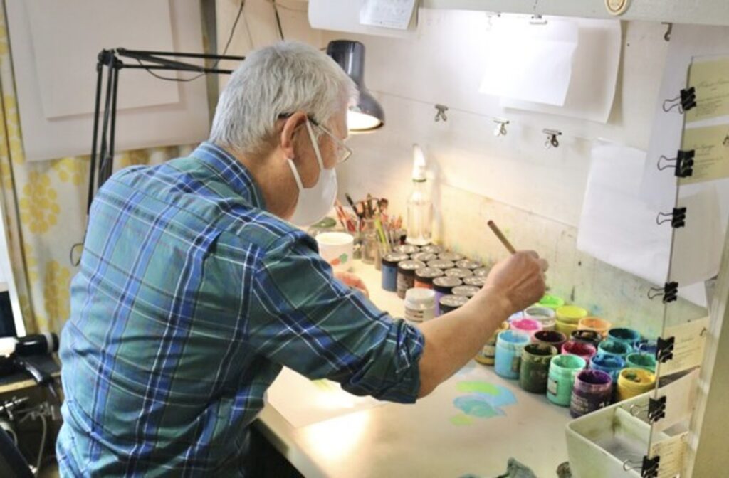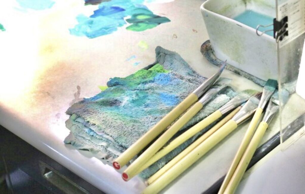 ちなみに絵の具は受け皿を使わず、 ちょくせつ作業テーブル上で混ぜ合わせるのが、次郎さん流。 作業で使う色の種類は、素人では思いもよらないほど膨大です。 そのためパレットや皿を使っていては、すぐ足りなくなってしまうそうです。