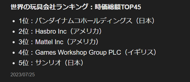 2023年の世界の玩具メーカー・時価総額ランキングを見ると、1位“バンダイナムコホールディングス”、5位に“サンリオ”、10位に“タカラトミー”と、ベスト10に日本の会社が3社もランクインしています。